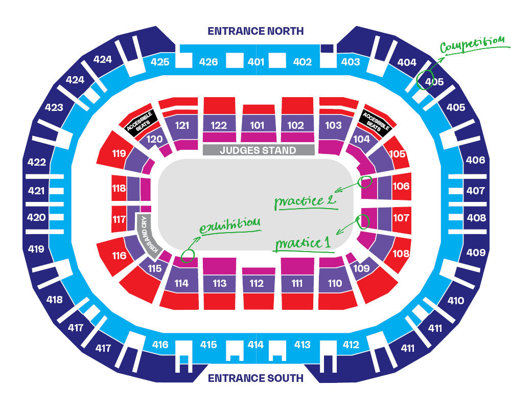 Not all is bleak, though! During the official practice sessions, which I attended twice, the top floor was closed, and spectators were allowed to take seats as close to the ice as they wished. On those two occasions, I sat at the short side of the rink across the way from the kiss & cry, which I later dubbed “the corner of death” because, for some reason, most skaters tend to do most of their jumps there, and consequently, most of the falls occur there as well.